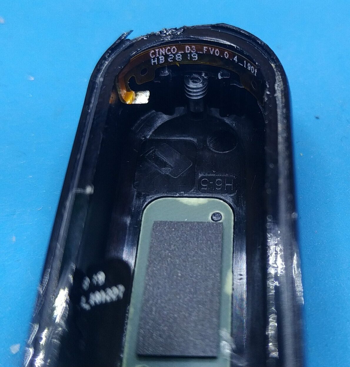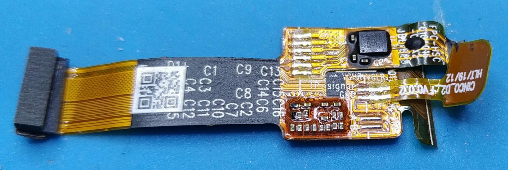 Glue holds the heart rate sensor at the bottom of the device in place and another FPC connector connects it with the main pcb . The connection is secured with a blob of hot glue.
